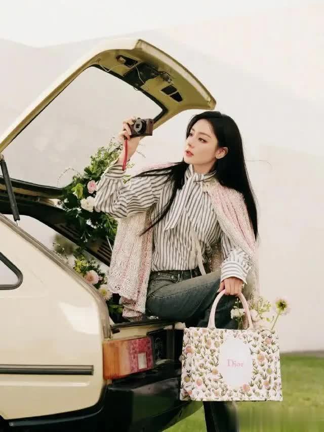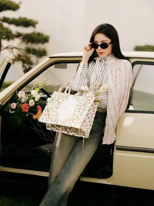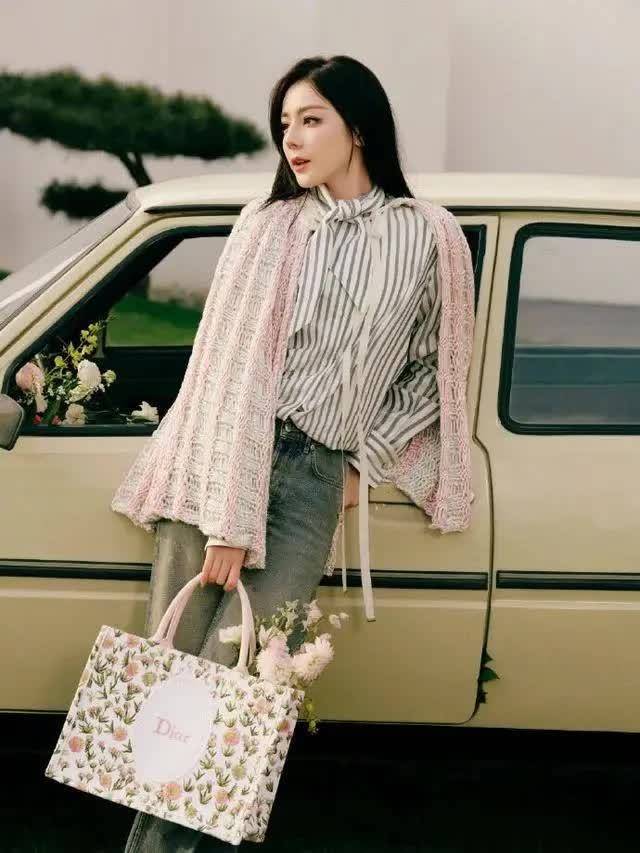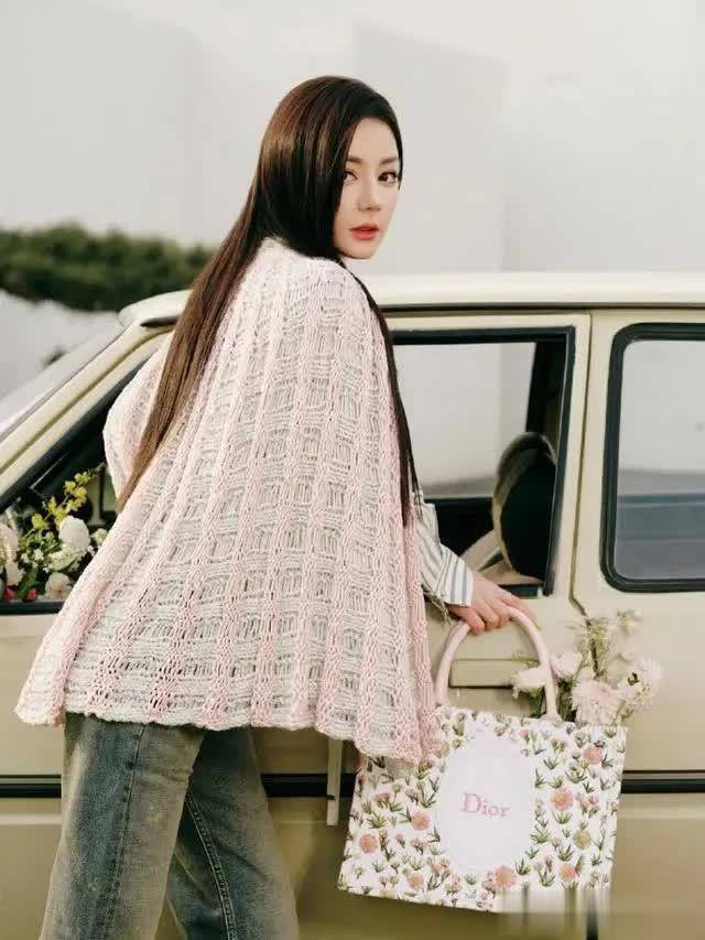 再来说说配饰,这几样小单品直接将整套造型的氛围感和品牌调性完美融合!首先是手中这只Dior花卉印花托特包,绝对是整套造型的点睛之笔。经典老花底纹配上清新春日花卉印花,与画面里的鲜花元素完美呼应,瞬间拉满整套造型的春日浪漫感,大容量完全适配长途出行需求,低调品牌标识不浮夸,却在细节处彰显全球品牌大使身份,与粉调开衫的柔媚感完美契合,处处见精致却处处不刻意。